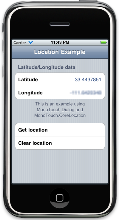 I decided to go with MonoTouch and MonoTouch.Dialog again because it’s really freaking easy to use. How easy? Well, to create the fully functional UI that fetches the current location and displays on screen is less than 50 lines of code: